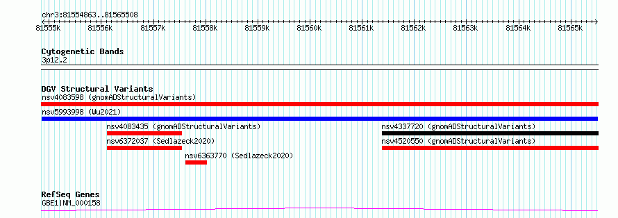 Variant DetailsVariant: nsv5993998| Internal ID | 21903341 | | Landmark | | | Location Information | | | Cytoband | 3p12.2 | | Allele length | | Assembly | Allele length | | hg38 | 10646 | | hg19 | 10646 |