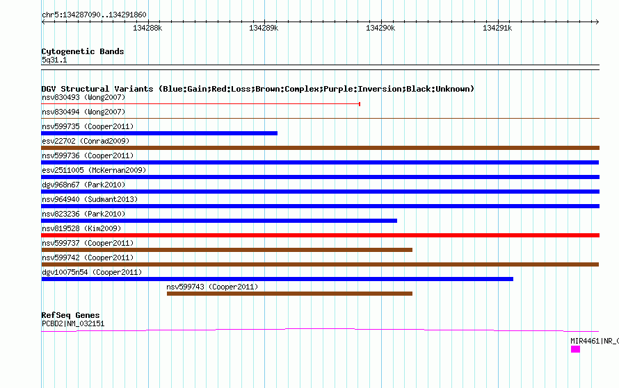 Variant DetailsVariant: nsv599742| Internal ID | 16387151 | | Landmark | | | Location Information | | | Cytoband | 5q31.1 | | Allele length | | Assembly | Allele length | | hg38 | 4771 | | hg19 | 4771 | | hg18 | 4771 |