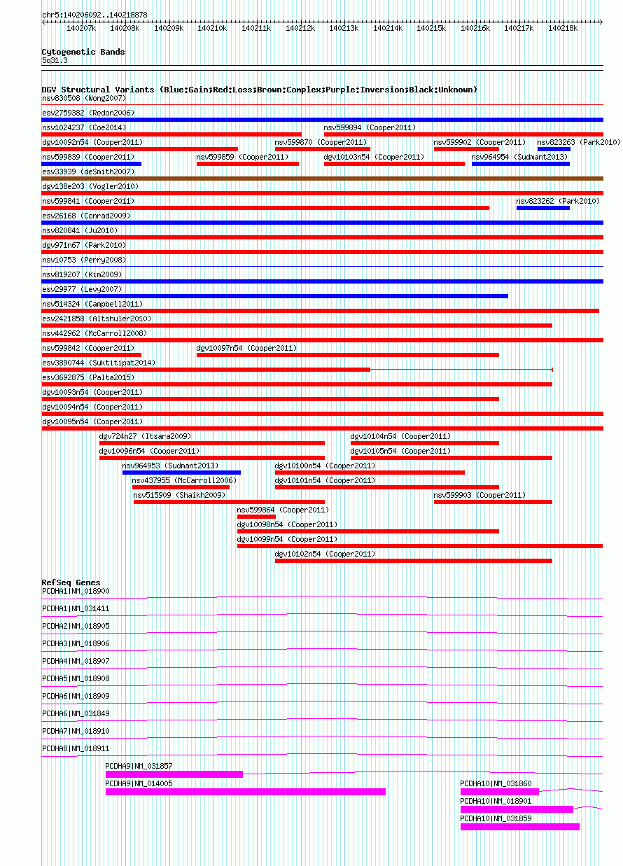 | | Variant Type | CNV loss | | Copy Number | | | Allele State | | | Allele Origin | | | Probe Count | | | Validation Flag | | | Merged Status | M | | Merged Variants | dgv10094n54 | | Supporting Variants | nssv1042167, nssv1042168 | | Samples | | | Known Genes | PCDHA1, PCDHA10, PCDHA2, PCDHA3, PCDHA4, PCDHA5, PCDHA6, PCDHA7, PCDHA8, PCDHA9 | | Method | SNP array | | Analysis | Illumina SNP array copy number analysis | | Platform | Not reported | | Comments | | | Reference | Cooper_et_al_2011 | | Pubmed ID | 21841781 | | Accession Number(s) | nsv599847