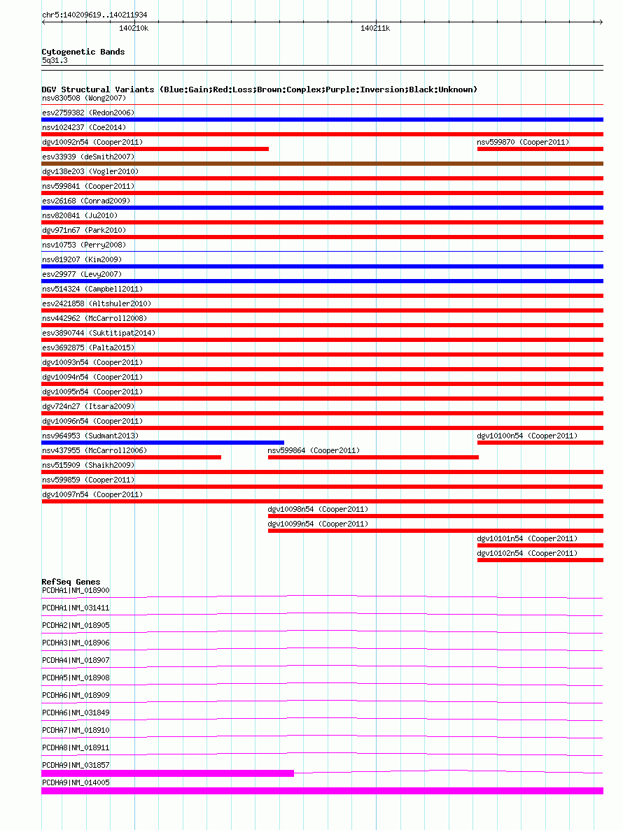 | | Variant Type | CNV loss | | Copy Number | | | Allele State | | | Allele Origin | | | Probe Count | | | Validation Flag | | | Merged Status | M | | Merged Variants | | | Supporting Variants | nssv1042211 | | Samples | | | Known Genes | PCDHA1, PCDHA2, PCDHA3, PCDHA4, PCDHA5, PCDHA6, PCDHA7, PCDHA8, PCDHA9 | | Method | SNP array | | Analysis | Illumina SNP array copy number analysis | | Platform | Not reported | | Comments | | | Reference | Cooper_et_al_2011 | | Pubmed ID | 21841781 | | Accession Number(s) | nsv599859