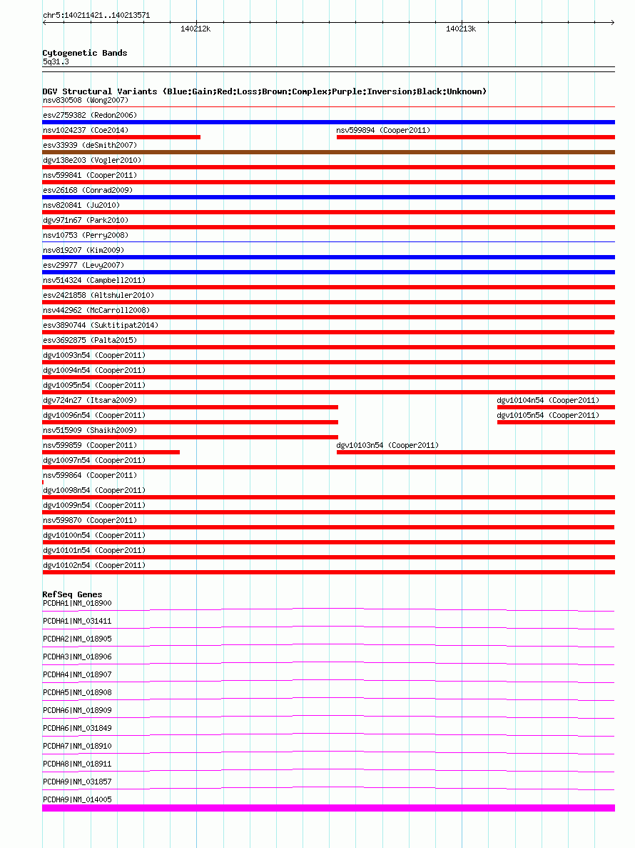 | | Variant Type | CNV loss | | Copy Number | | | Allele State | | | Allele Origin | | | Probe Count | | | Validation Flag | | | Merged Status | M | | Merged Variants | | | Supporting Variants | nssv1042239, nssv1042238 | | Samples | | | Known Genes | PCDHA1, PCDHA2, PCDHA3, PCDHA4, PCDHA5, PCDHA6, PCDHA7, PCDHA8, PCDHA9 | | Method | SNP array | | Analysis | Illumina SNP array copy number analysis | | Platform | Not reported | | Comments | | | Reference | Cooper_et_al_2011 | | Pubmed ID | 21841781 | | Accession Number(s) | nsv599870