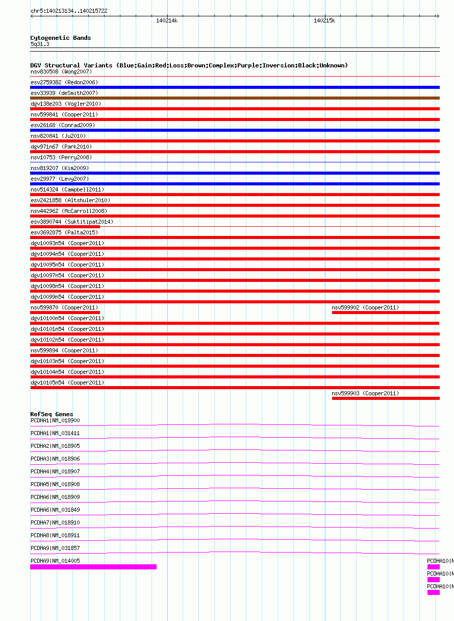 | | Variant Type | CNV loss | | Copy Number | | | Allele State | | | Allele Origin | | | Probe Count | | | Validation Flag | | | Merged Status | M | | Merged Variants | dgv10104n54 | | Supporting Variants | nssv1042385 | | Samples | | | Known Genes | PCDHA1, PCDHA10, PCDHA2, PCDHA3, PCDHA4, PCDHA5, PCDHA6, PCDHA7, PCDHA8, PCDHA9 | | Method | SNP array | | Analysis | Illumina SNP array copy number analysis | | Platform | Not reported | | Comments | | | Reference | Cooper_et_al_2011 | | Pubmed ID | 21841781 | | Accession Number(s) | nsv599895