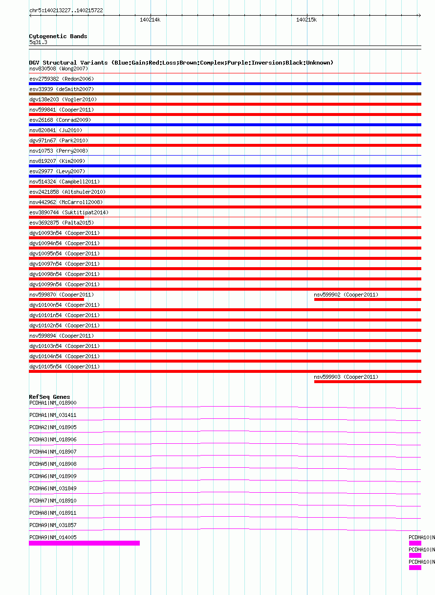 | | Variant Type | CNV loss | | Copy Number | | | Allele State | | | Allele Origin | | | Probe Count | | | Validation Flag | | | Merged Status | M | | Merged Variants | dgv10104n54 | | Supporting Variants | nssv1042395 | | Samples | | | Known Genes | PCDHA1, PCDHA10, PCDHA2, PCDHA3, PCDHA4, PCDHA5, PCDHA6, PCDHA7, PCDHA8, PCDHA9 | | Method | SNP array | | Analysis | Illumina SNP array copy number analysis | | Platform | Not reported | | Comments | | | Reference | Cooper_et_al_2011 | | Pubmed ID | 21841781 | | Accession Number(s) | nsv599899
