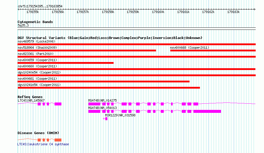 | | Variant Type | CNV loss | | Copy Number | | | Allele State | | | Allele Origin | | | Probe Count | | | Validation Flag | | | Merged Status | M | | Merged Variants | dgv10240n54 | | Supporting Variants | nssv1047028, nssv1047029 | | Samples | | | Known Genes | LTC4S, MGAT4B, MIR1229 | | Method | SNP array | | Analysis | Illumina SNP array copy number analysis | | Platform | Not reported | | Comments | | | Reference | Cooper_et_al_2011 | | Pubmed ID | 21841781 | | Accession Number(s) | nsv600665