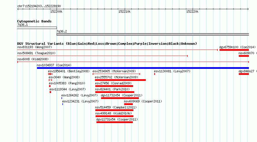 Variant DetailsVariant: nsv6008| Internal ID | 15204188 | | Landmark | | | Location Information | | | Cytoband | 7q36.1 | | Allele length | | Assembly | Allele length | | hg38 | 33988 | | hg19 | 33988 | | hg18 | 33988 | | hg17 | 33988 |