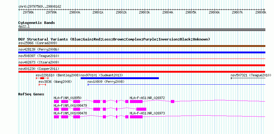 Variant DetailsVariant: nsv601230| Internal ID | 16388639 | | Landmark | | | Location Information | | | Cytoband | 6p22.1 | | Allele length | | Assembly | Allele length | | hg38 | 10594 | | hg19 | 10594 | | hg18 | 10594 |
