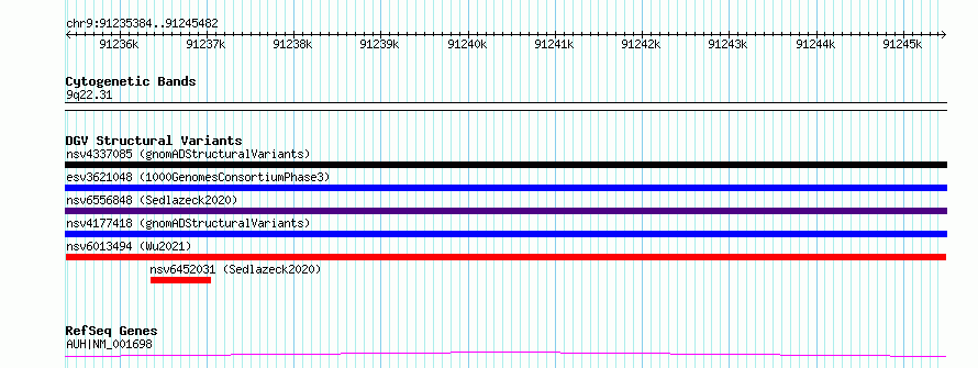 Variant DetailsVariant: nsv6013494| Internal ID | 21922837 | | Landmark | | | Location Information | | | Cytoband | 9q22.31 | | Allele length | | Assembly | Allele length | | hg38 | 10099 | | hg19 | 10099 |