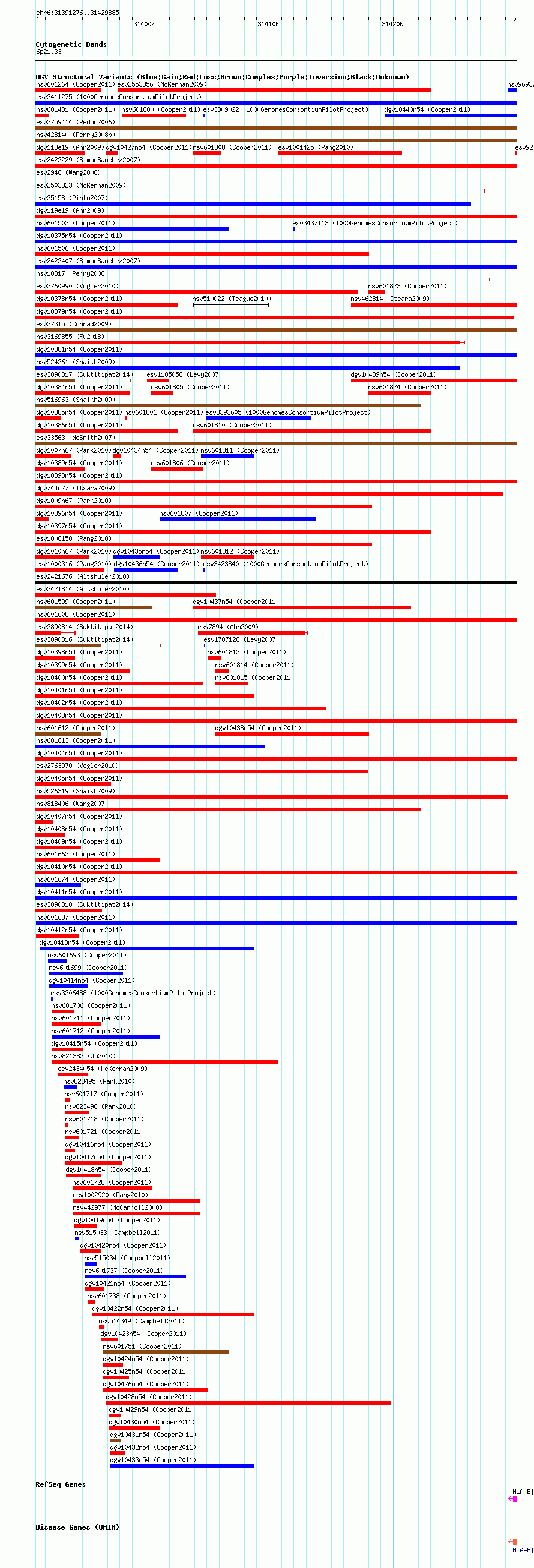 Variant DetailsVariant: nsv601684| Internal ID | 16389093 | | Landmark | | | Location Information | | | Cytoband | 6p21.33 | | Allele length | | Assembly | Allele length | | hg38 | 38610 | | hg19 | 38610 | | hg18 | 38610 |