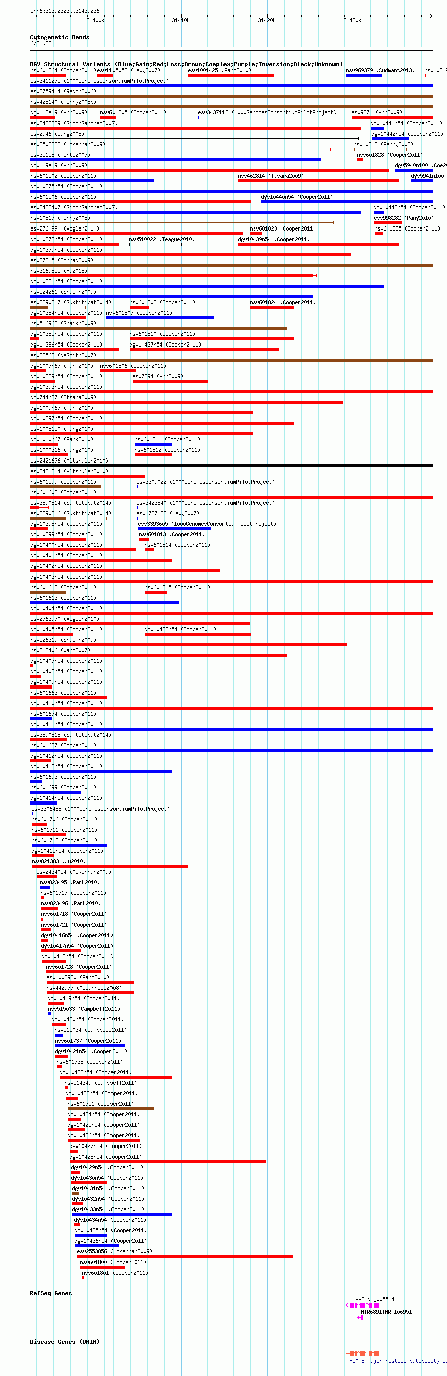 Variant DetailsVariant: nsv601703| Internal ID | 16389112 | | Landmark | | | Location Information | | | Cytoband | 6p21.33 | | Allele length | | Assembly | Allele length | | hg38 | 46914 | | hg19 | 46914 | | hg18 | 46914 |