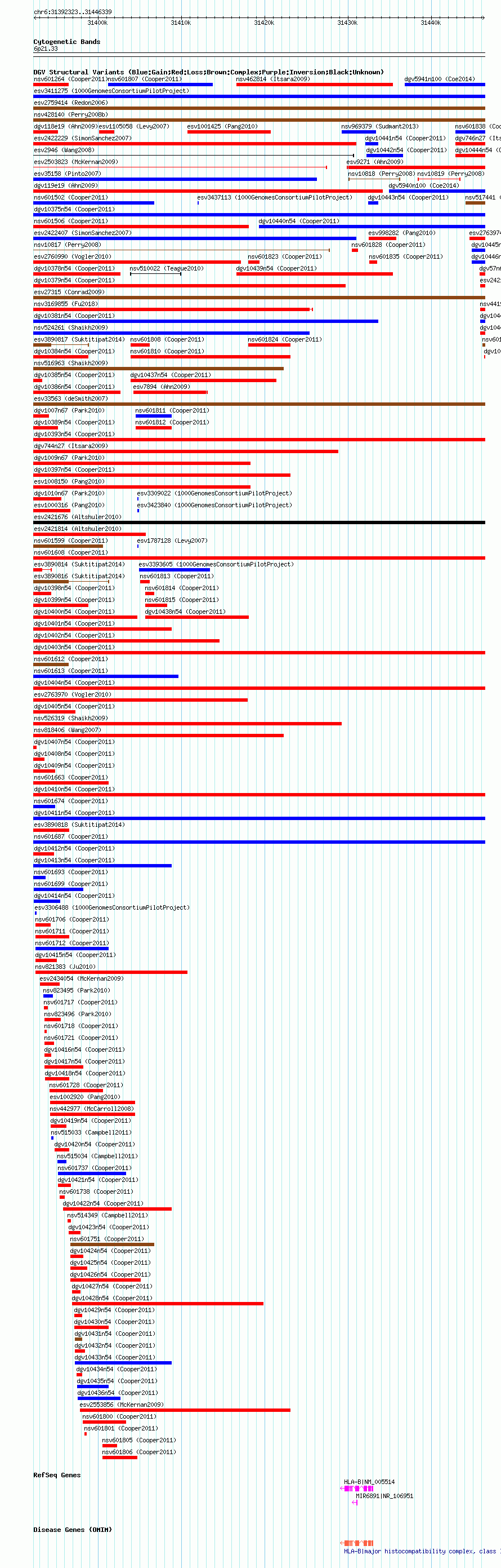 Variant DetailsVariant: nsv601704| Internal ID | 16389113 | | Landmark | | | Location Information | | | Cytoband | 6p21.33 | | Allele length | | Assembly | Allele length | | hg38 | 54017 | | hg19 | 54017 | | hg18 | 54017 |