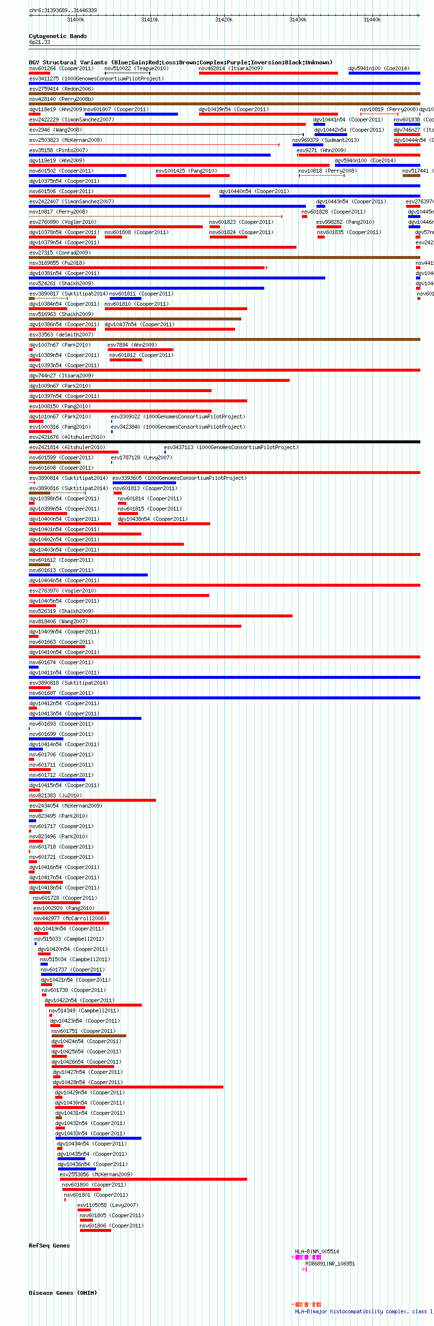 Variant DetailsVariant: nsv601726| Internal ID | 16389135 | | Landmark | | | Location Information | | | Cytoband | 6p21.33 | | Allele length | | Assembly | Allele length | | hg38 | 52651 | | hg19 | 52651 | | hg18 | 52651 |