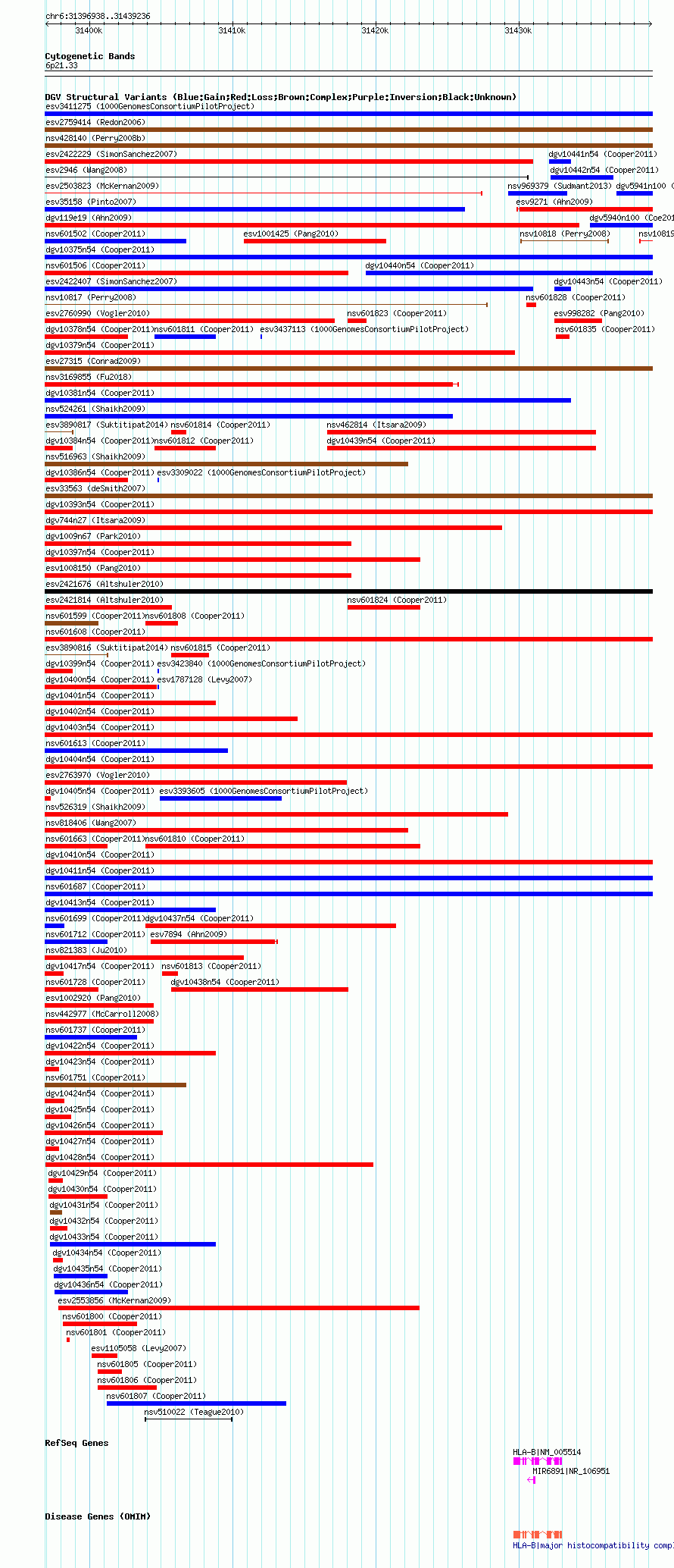 Variant DetailsVariant: nsv601758| Internal ID | 16389167 | | Landmark | | | Location Information | | | Cytoband | 6p21.33 | | Allele length | | Assembly | Allele length | | hg38 | 42299 | | hg19 | 42299 | | hg18 | 42299 |