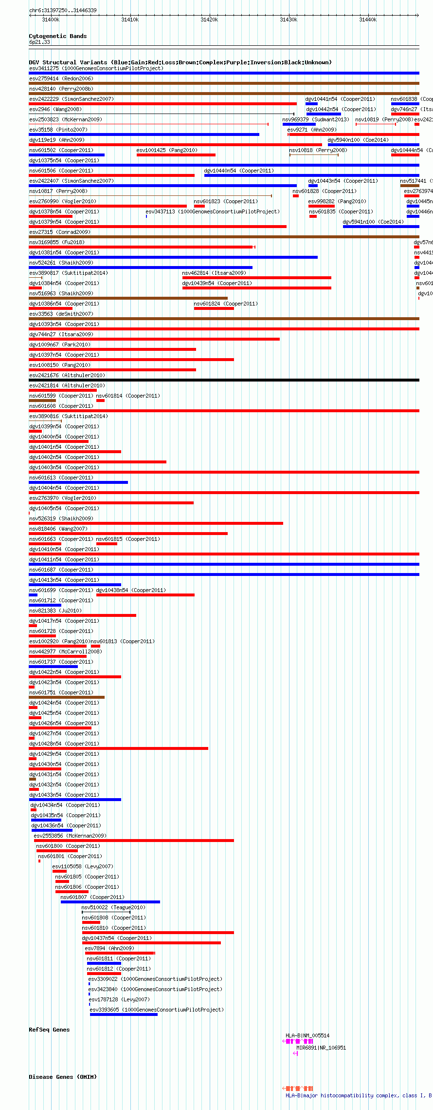 Variant DetailsVariant: nsv601776| Internal ID | 16389185 | | Landmark | | | Location Information | | | Cytoband | 6p21.33 | | Allele length | | Assembly | Allele length | | hg38 | 49090 | | hg19 | 49090 | | hg18 | 49090 |
