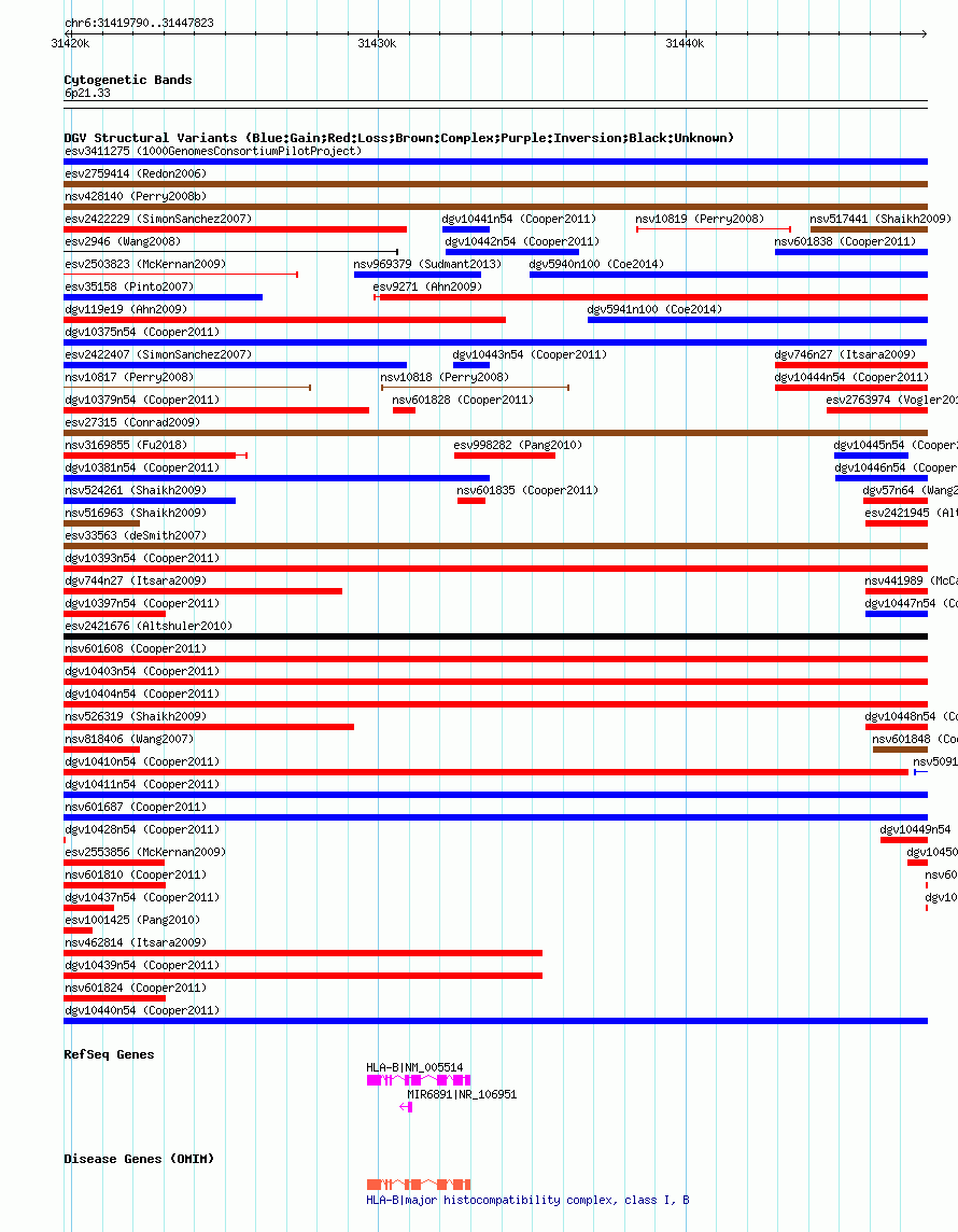 Variant DetailsVariant: nsv601826| Internal ID | 16389235 | | Landmark | | | Location Information | | | Cytoband | 6p21.33 | | Allele length | | Assembly | Allele length | | hg38 | 28034 | | hg19 | 28034 | | hg18 | 28034 |