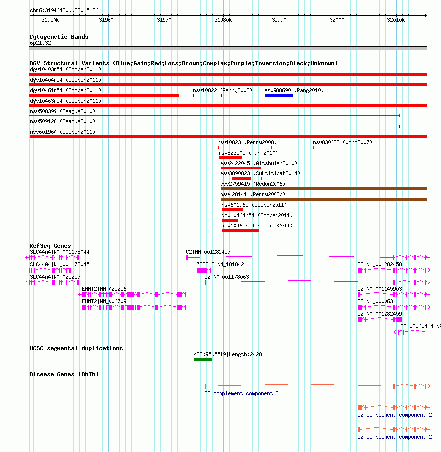 | | Variant Type | CNV loss | | Copy Number | | | Allele State | | | Allele Origin | | | Probe Count | | | Validation Flag | | | Merged Status | M | | Merged Variants | | | Supporting Variants | nssv1053547 | | Samples | | | Known Genes | C2, EHMT2, LOC102060414, SLC44A4, ZBTB12 | | Method | SNP array | | Analysis | Illumina SNP array copy number analysis | | Platform | Not reported | | Comments | | | Reference | Cooper_et_al_2011 | | Pubmed ID | 21841781 | | Accession Number(s) | nsv601960