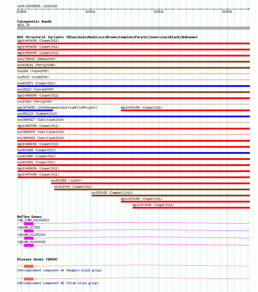 | | Variant Type | CNV loss | | Copy Number | | | Allele State | | | Allele Origin | | | Probe Count | | | Validation Flag | | | Merged Status | M | | Merged Variants | dgv10469n54 | | Supporting Variants | nssv1053589, nssv1053591, nssv1053592, nssv1053593, nssv1053590 | | Samples | | | Known Genes | C4A, C4B, C4B_2 | | Method | SNP array | | Analysis | Illumina SNP array copy number analysis | | Platform | Not reported | | Comments | | | Reference | Cooper_et_al_2011 | | Pubmed ID | 21841781 | | Accession Number(s) | nsv601985