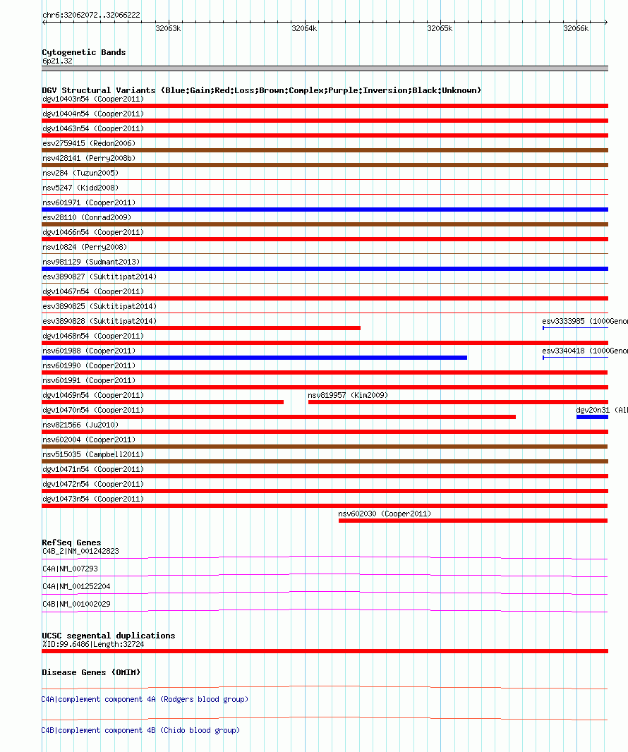 | | Variant Type | CNV loss | | Copy Number | | | Allele State | | | Allele Origin | | | Probe Count | | | Validation Flag | | | Merged Status | M | | Merged Variants | dgv10473n54 | | Supporting Variants | nssv1053690, nssv1053687, nssv1053697, nssv1053694, nssv1053691, nssv1053700, nssv1053689, nssv1053688, nssv1053693, nssv1053699, nssv1053703, nssv1053696, nssv1053692, nssv1053702, nssv1053698, nssv1053701, nssv1053686, nssv1053695 | | Samples | | | Known Genes | C4A, C4B, C4B_2 | | Method | SNP array | | Analysis | Illumina SNP array copy number analysis | | Platform | Not reported | | Comments | | | Reference | Cooper_et_al_2011 | | Pubmed ID | 21841781 | | Accession Number(s) | nsv602022
