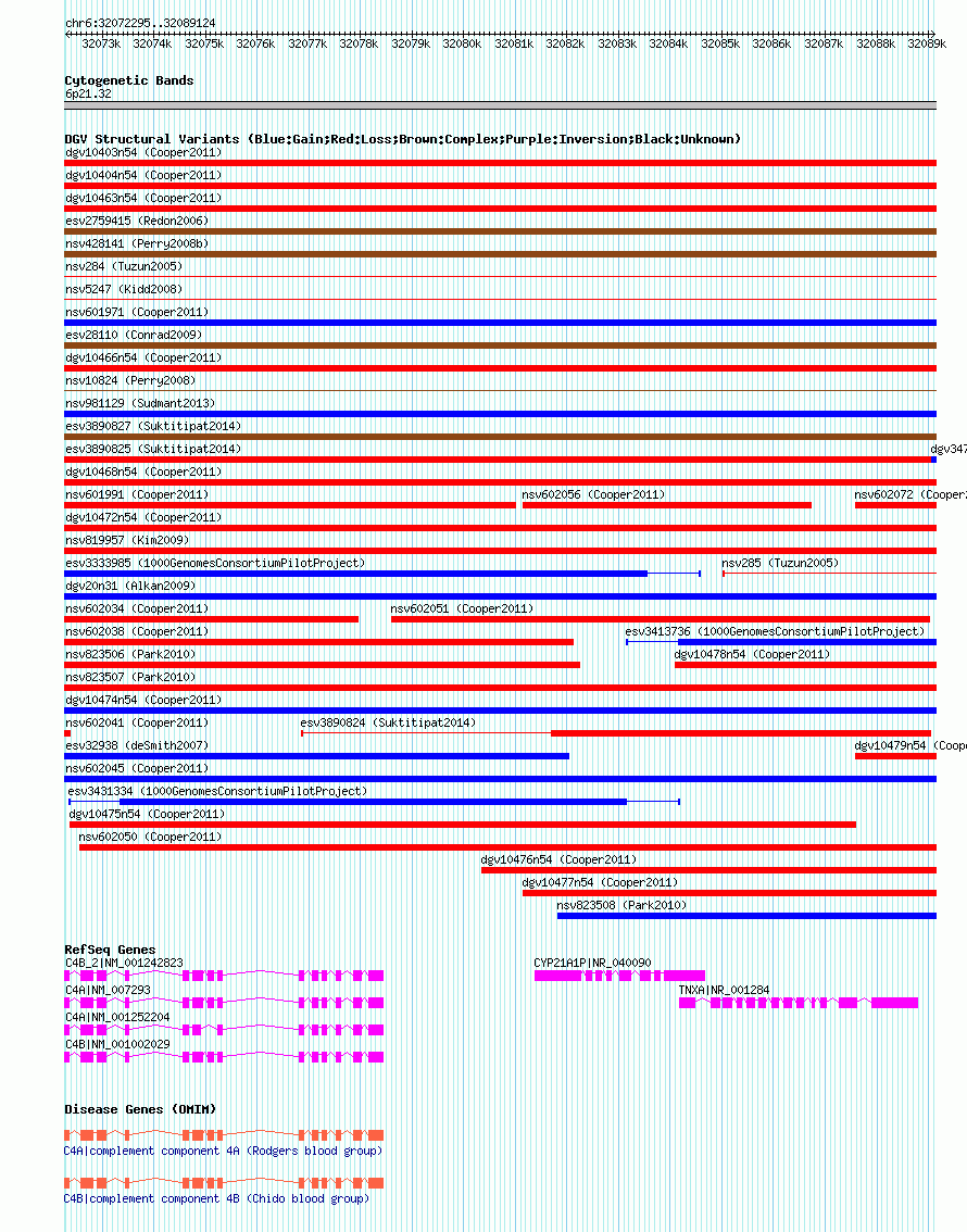 | | Variant Type | CNV gain | | Copy Number | | | Allele State | | | Allele Origin | | | Probe Count | | | Validation Flag | | | Merged Status | M | | Merged Variants | dgv10474n54 | | Supporting Variants | nssv1053782 | | Samples | | | Known Genes | C4A, C4B, C4B_2, CYP21A1P, CYP21A2, TNXA, TNXB | | Method | SNP array | | Analysis | Illumina SNP array copy number analysis | | Platform | Not reported | | Comments | | | Reference | Cooper_et_al_2011 | | Pubmed ID | 21841781 | | Accession Number(s) | nsv602046