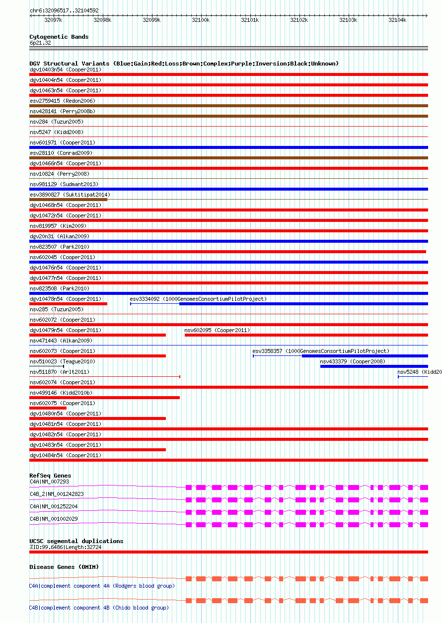 | Variant Type | CNV loss | Copy Number | | Allele State | | Allele Origin | | Probe Count | | Validation Flag | | Merged Status | M | Merged Variants | dgv10484n54 | Supporting Variants | nssv1053884, nssv1053889, nssv1053887, nssv1053888, nssv1053881, nssv1053890, nssv1053882, nssv1053886, nssv1053885, nssv1053891, nssv1053883 | Samples | | Known Genes | C4A, C4B, C4B_2 | Method | SNP array | Analysis | Illumina SNP array copy number analysis | Platform | Not reported | Comments | | Reference | Cooper_et_al_2011 | Pubmed ID | 21841781 | Accession Number(s) | nsv602092