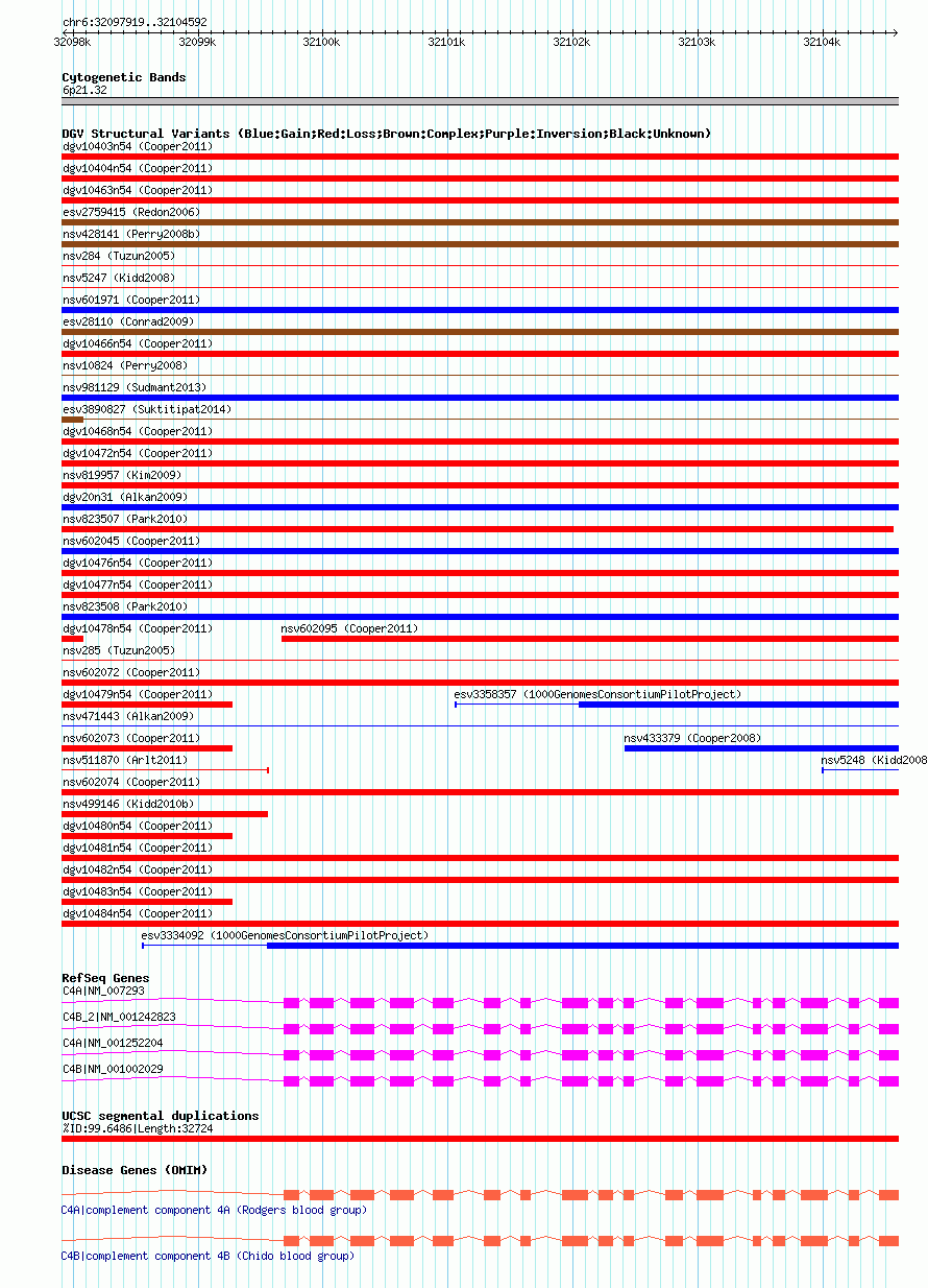 | Variant Type | CNV loss | Copy Number | | Allele State | | Allele Origin | | Probe Count | | Validation Flag | | Merged Status | M | Merged Variants | dgv10484n54 | Supporting Variants | nssv1053893, nssv1053894 | Samples | | Known Genes | C4A, C4B, C4B_2 | Method | SNP array | Analysis | Illumina SNP array copy number analysis | Platform | Not reported | Comments | | Reference | Cooper_et_al_2011 | Pubmed ID | 21841781 | Accession Number(s) | nsv602094