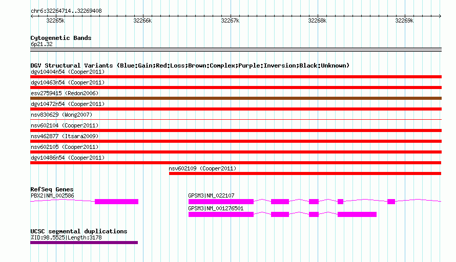 Variant DetailsVariant: nsv602107| Internal ID | 16042830 | | Landmark | | | Location Information | | | Cytoband | 6p21.32 | | Allele length | | Assembly | Allele length | | hg38 | 4695 | | hg19 | 4695 | | hg18 | 4695 |