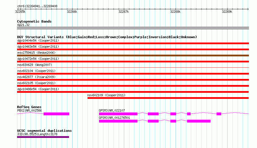 Variant DetailsVariant: nsv602108| Internal ID | 16042831 | | Landmark | | | Location Information | | | Cytoband | 6p21.32 | | Allele length | | Assembly | Allele length | | hg38 | 4468 | | hg19 | 4468 | | hg18 | 4468 |