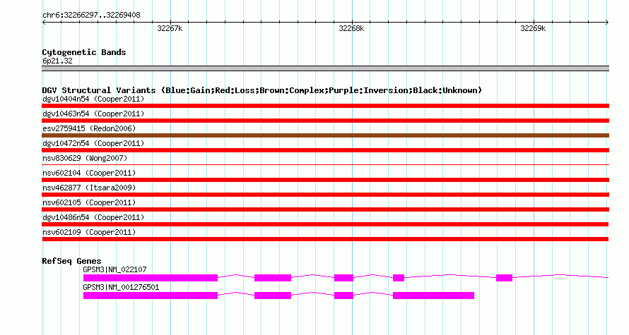 Variant DetailsVariant: nsv602109| Internal ID | 16042832 | | Landmark | | | Location Information | | | Cytoband | 6p21.32 | | Allele length | | Assembly | Allele length | | hg38 | 3112 | | hg19 | 3112 | | hg18 | 3112 |