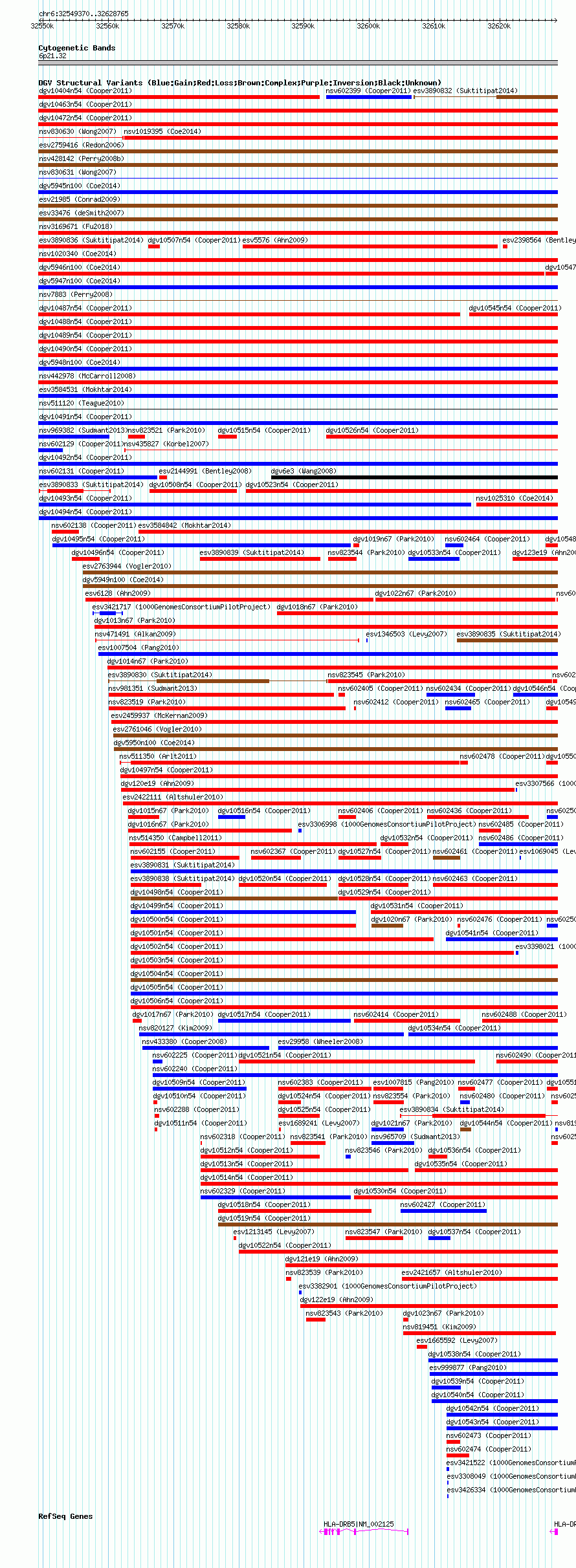 Variant DetailsVariant: nsv602133| Internal ID | 16389542 | | Landmark | | | Location Information | | | Cytoband | 6p21.32 | | Allele length | | Assembly | Allele length | | hg38 | 79396 | | hg19 | 79396 | | hg18 | 79396 |