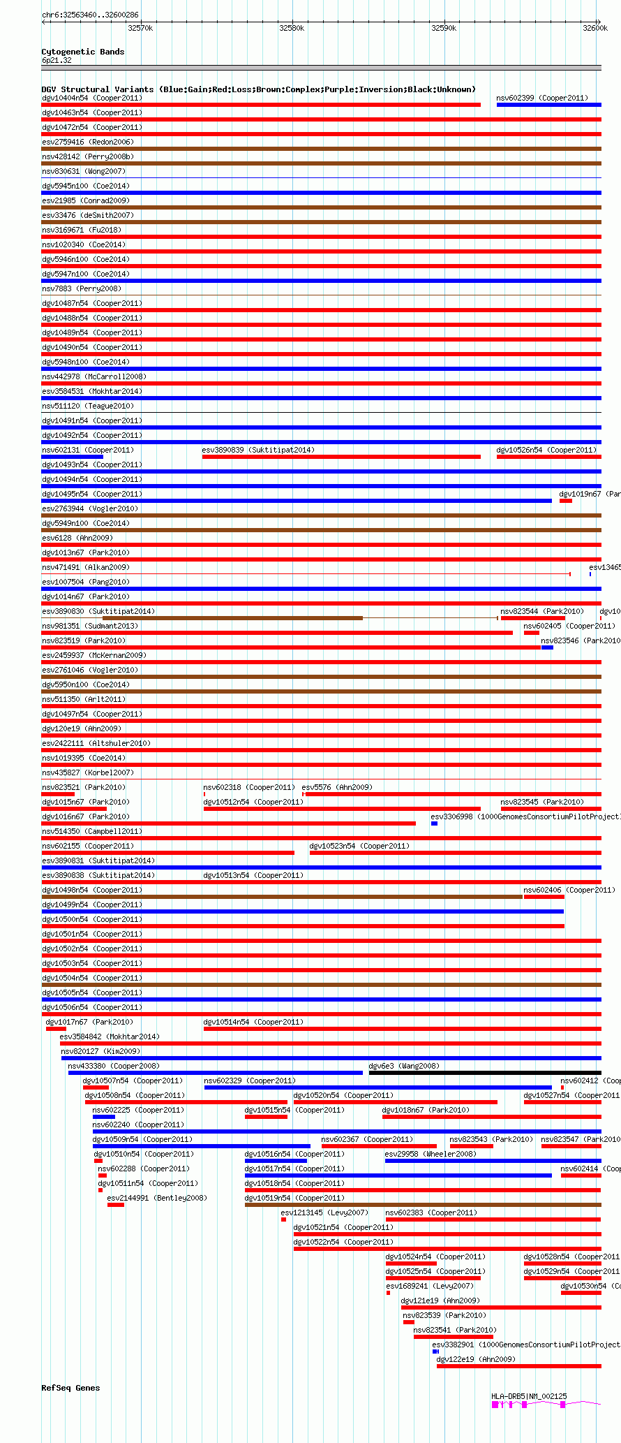 Variant DetailsVariant: nsv602160 | Internal ID | 16389569 | | Landmark | | | Location Information | | | Cytoband | 6p21.32 | | Allele length | | Assembly | Allele length | | hg38 | 36827 | | hg19 | 36827 | | hg18 | 36827 |