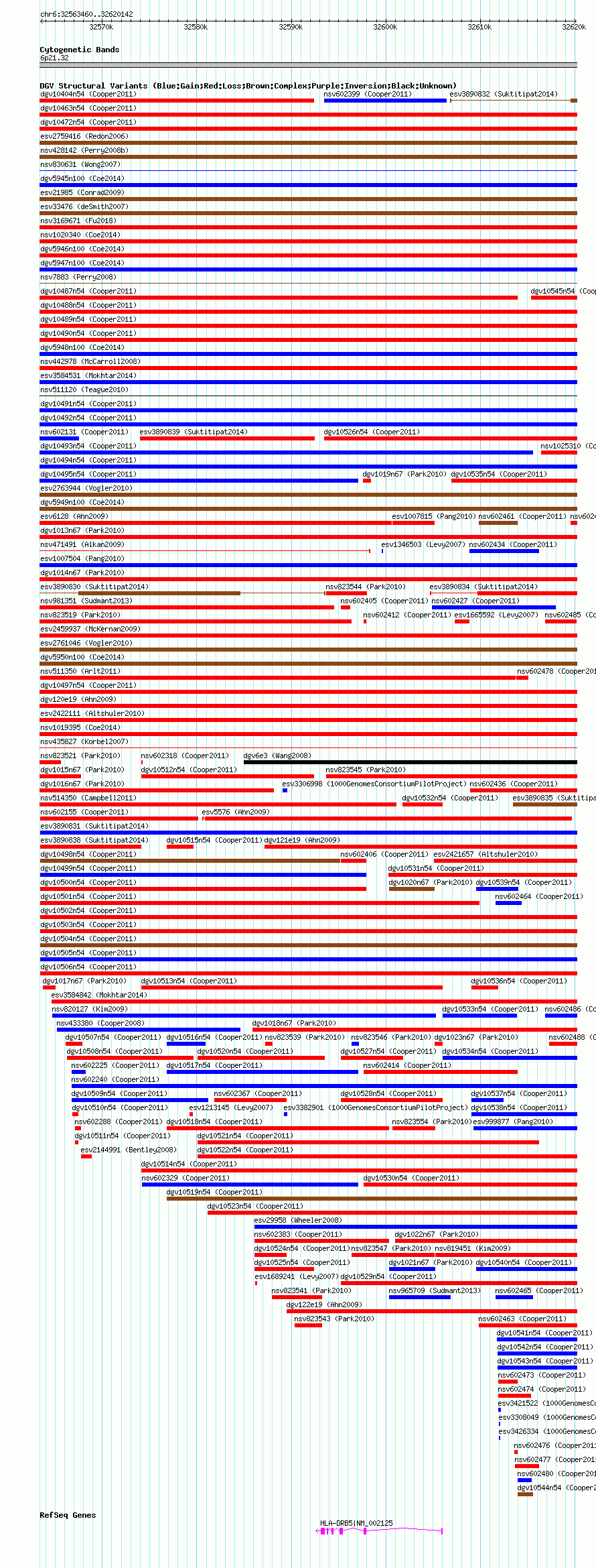 Variant DetailsVariant: nsv602168| Internal ID | 16389577 | | Landmark | | | Location Information | | | Cytoband | 6p21.32 | | Allele length | | Assembly | Allele length | | hg38 | 56683 | | hg19 | 56683 | | hg18 | 56683 |