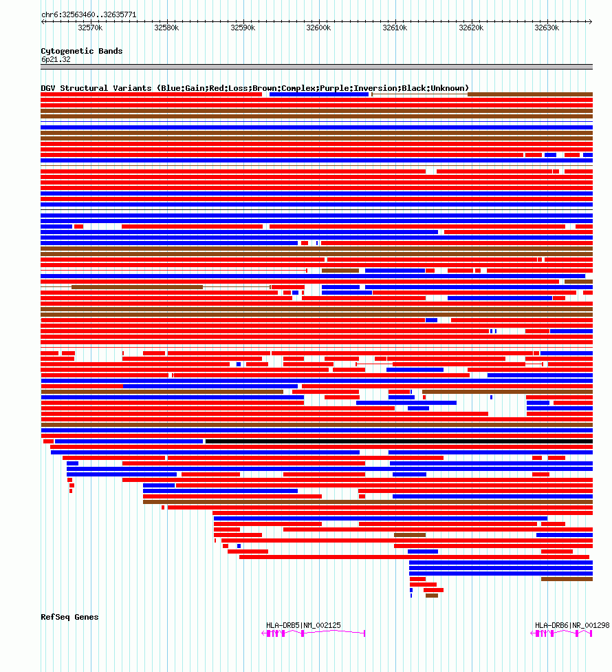 Variant DetailsVariant: nsv602173| Internal ID | 16389582 | | Landmark | | | Location Information | | | Cytoband | 6p21.32 | | Allele length | | Assembly | Allele length | | hg38 | 72312 | | hg19 | 72312 | | hg18 | 72312 |