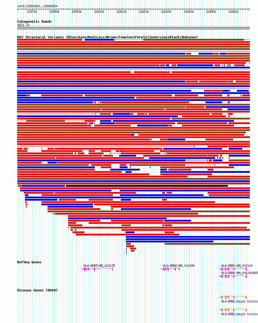 Variant DetailsVariant: nsv602181| Internal ID | 16389590 | | Landmark | | | Location Information | | | Cytoband | 6p21.32 | | Allele length | | Assembly | Allele length | | hg38 | 103465 | | hg19 | 103465 | | hg18 | 103465 |