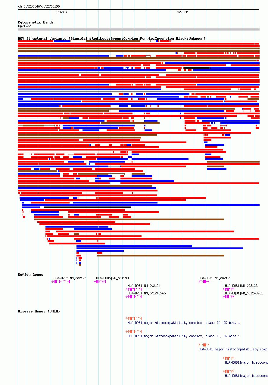 Variant DetailsVariant: nsv602187| Internal ID | 16389596 | | Landmark | | | Location Information | | | Cytoband | 6p21.32 | | Allele length | | Assembly | Allele length | | hg38 | 199737 | | hg19 | 199737 | | hg18 | 199737 |