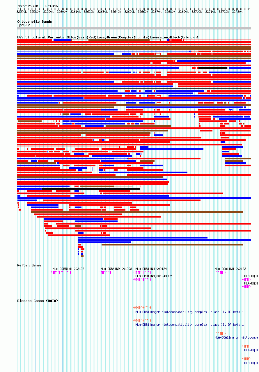 Variant DetailsVariant: nsv602239| Internal ID | 16389648 | | Landmark | | | Location Information | | | Cytoband | 6p21.32 | | Allele length | | Assembly | Allele length | | hg38 | 172619 | | hg19 | 172619 | | hg18 | 172619 |
