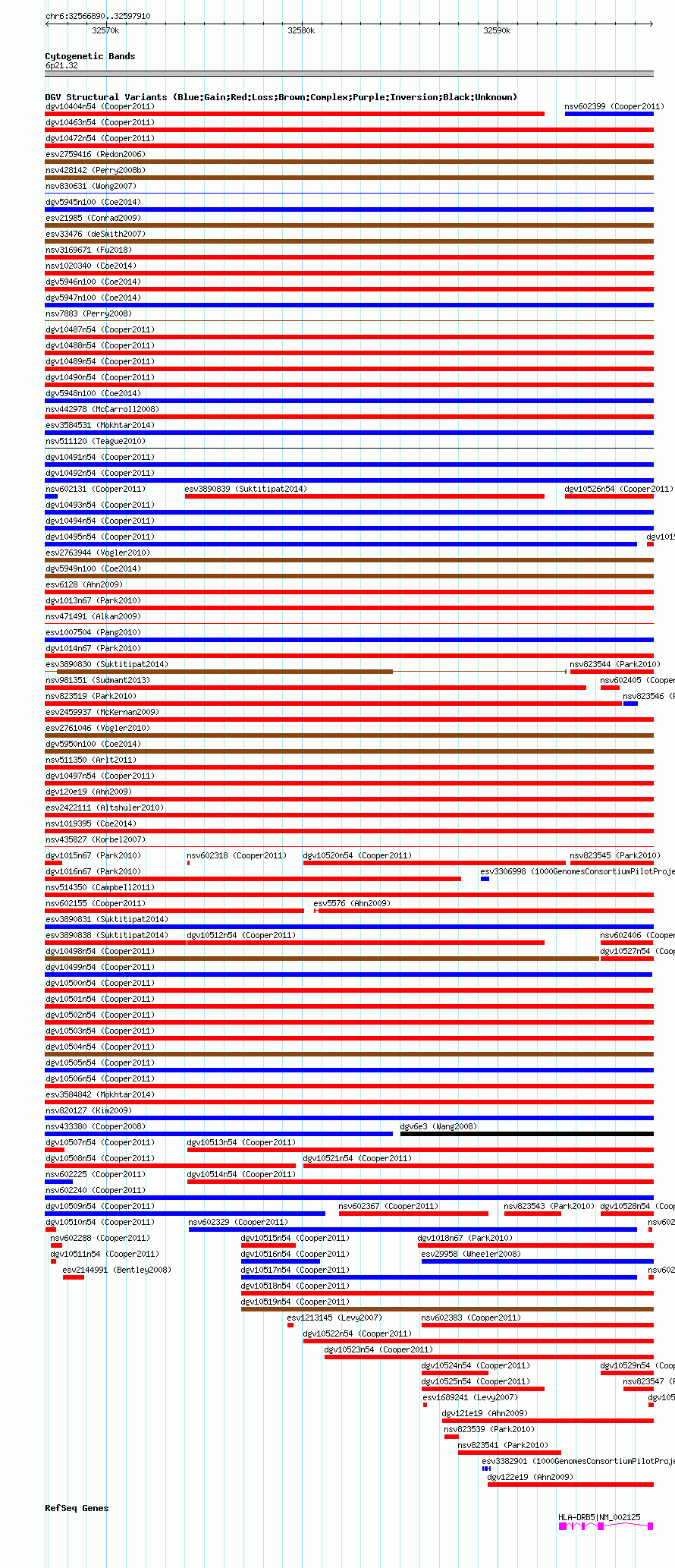 Variant DetailsVariant: nsv602250| Internal ID | 16389659 | | Landmark | | | Location Information | | | Cytoband | 6p21.32 | | Allele length | | Assembly | Allele length | | hg38 | 31021 | | hg19 | 31021 | | hg18 | 31021 |
