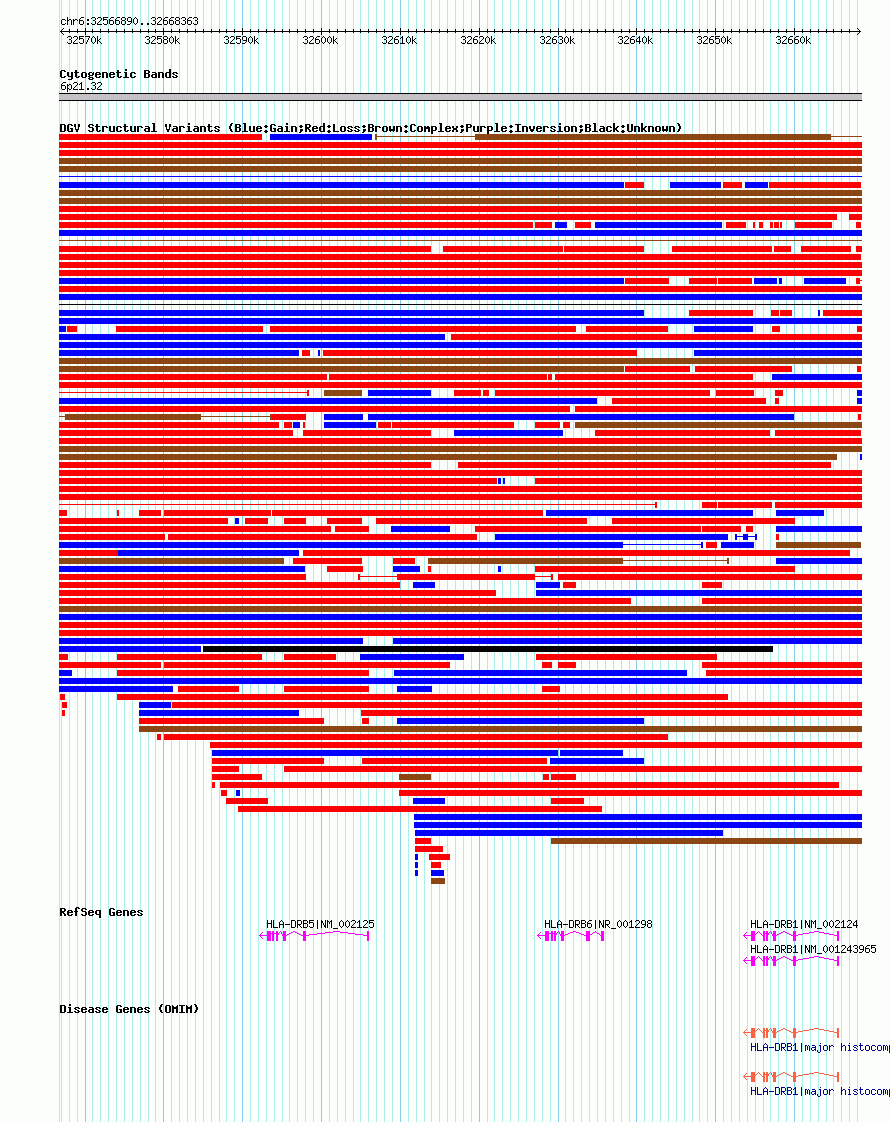 Variant DetailsVariant: nsv602270| Internal ID | 16389679 | | Landmark | | | Location Information | | | Cytoband | 6p21.32 | | Allele length | | Assembly | Allele length | | hg38 | 101474 | | hg19 | 101474 | | hg18 | 101474 |