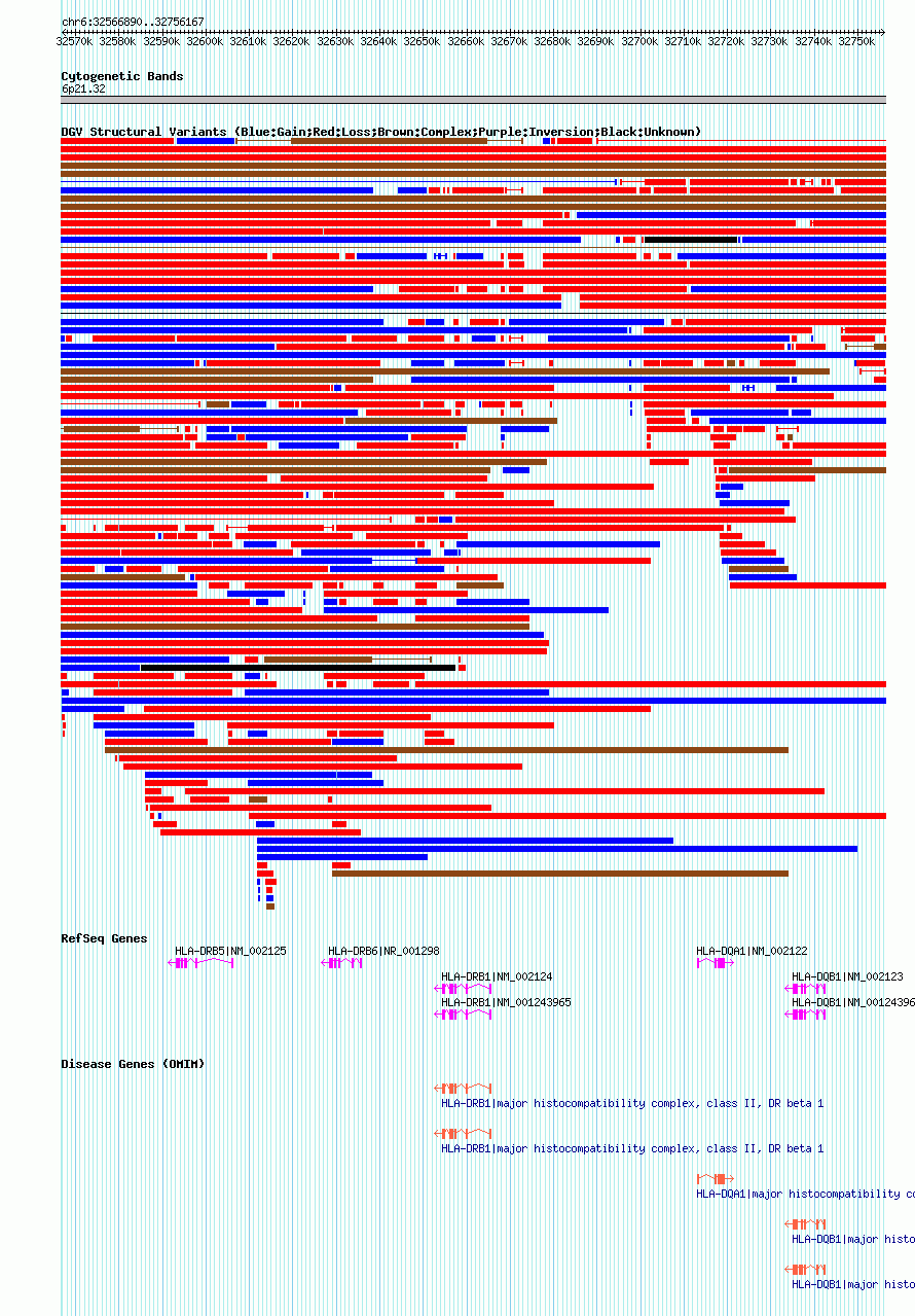 | | Variant Type | CNV loss | | Copy Number | | | Allele State | | | Allele Origin | | | Probe Count | | | Validation Flag | | | Merged Status | M | | Merged Variants | dgv10489n54 | | Supporting Variants | nssv1054927 | | Samples | | | Known Genes | HLA-DQA1, HLA-DQB1, HLA-DRB1, HLA-DRB5, HLA-DRB6 | | Method | SNP array | | Analysis | Illumina SNP array copy number analysis | | Platform | Not reported | | Comments | | | Reference | Cooper_et_al_2011 | | Pubmed ID | 21841781 | | Accession Number(s) | nsv602282