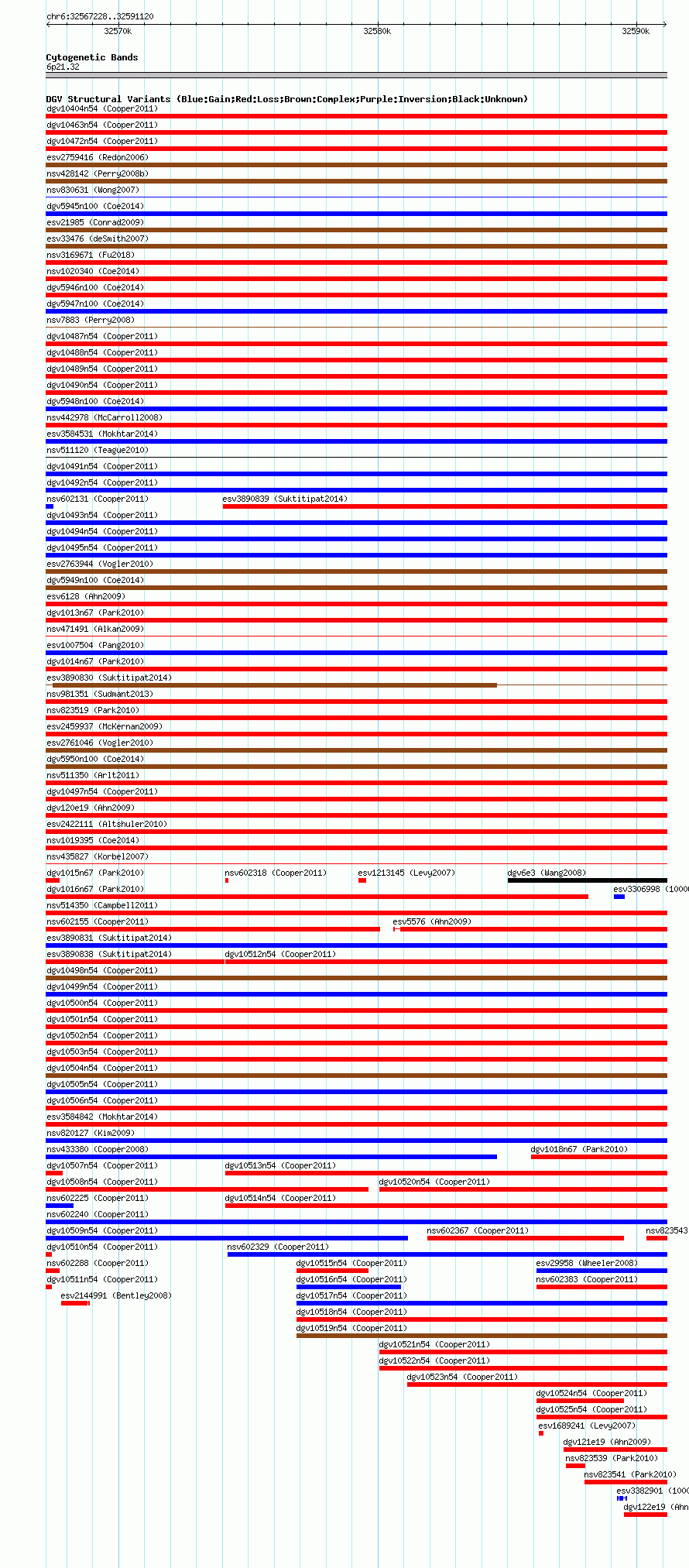 Variant DetailsVariant: nsv602295| Internal ID | 16389704 | | Landmark | | | Location Information | | | Cytoband | 6p21.32 | | Allele length | | Assembly | Allele length | | hg38 | 23893 | | hg19 | 23893 | | hg18 | 23893 |