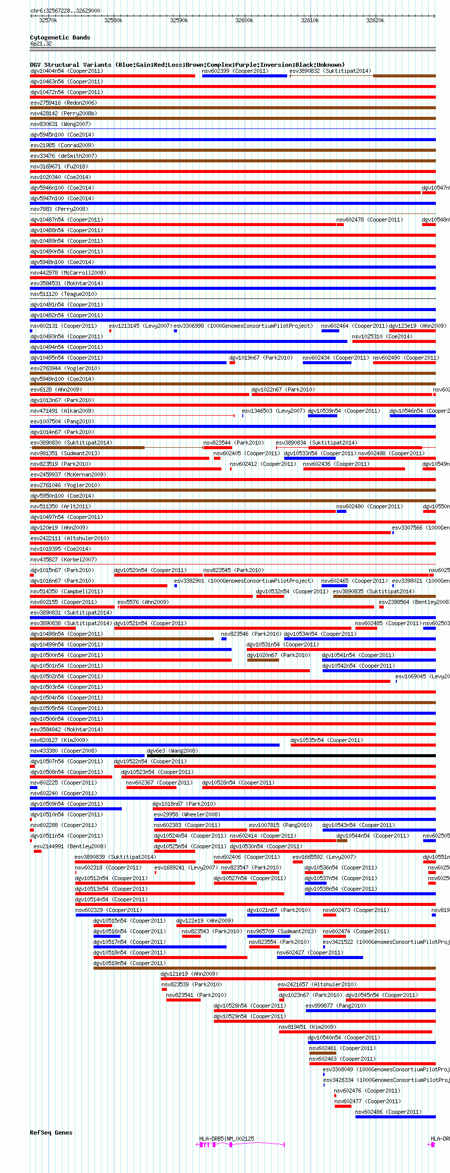 Variant DetailsVariant: nsv602297| Internal ID | 16389706 | | Landmark | | | Location Information | | | Cytoband | 6p21.32 | | Allele length | | Assembly | Allele length | | hg38 | 61773 | | hg19 | 61773 | | hg18 | 61773 |