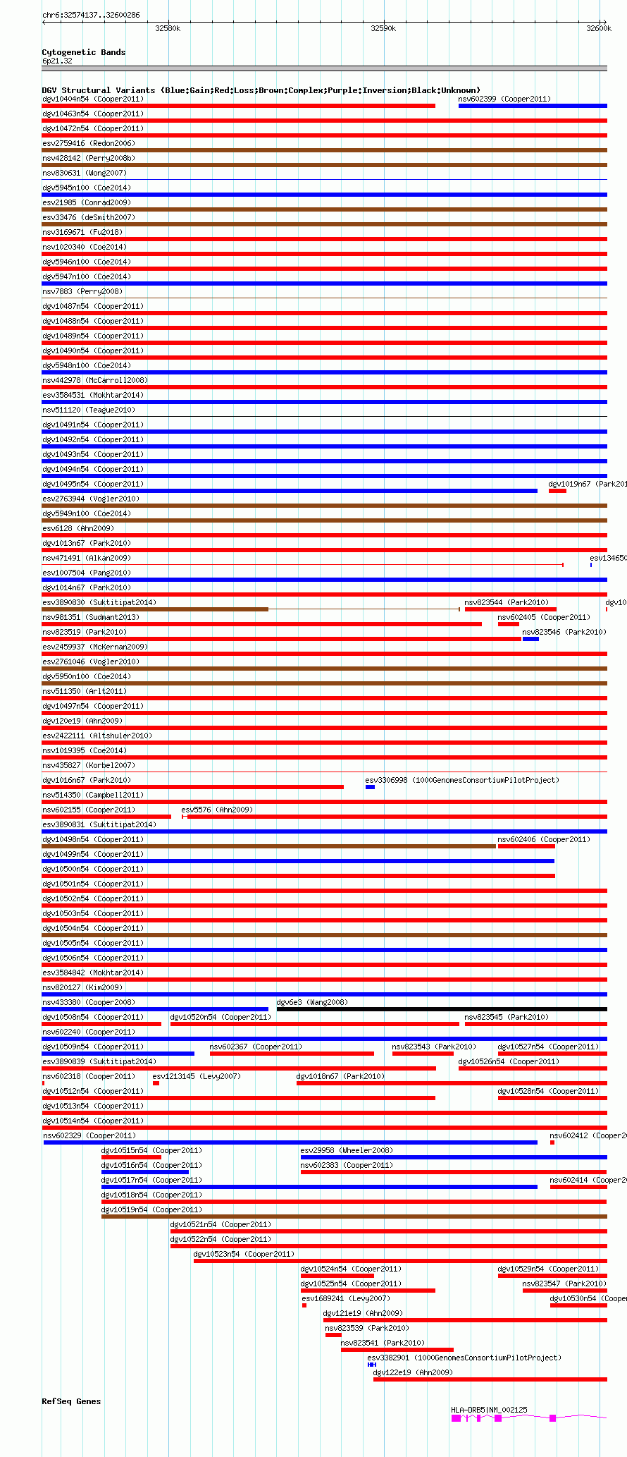 Variant DetailsVariant: nsv602320 | Internal ID | 16389729 | | Landmark | | | Location Information | | | Cytoband | 6p21.32 | | Allele length | | Assembly | Allele length | | hg38 | 26150 | | hg19 | 26150 | | hg18 | 26150 |