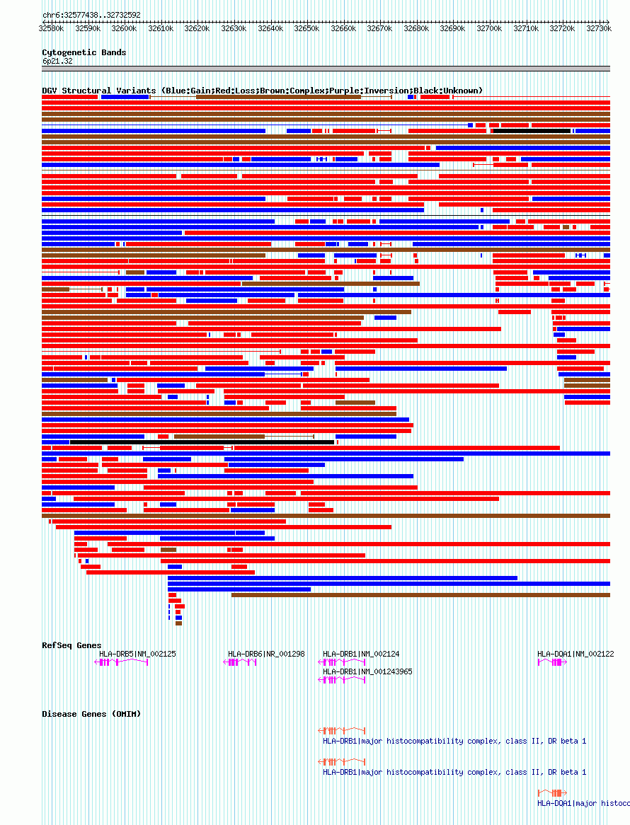 Variant DetailsVariant: nsv602346| Internal ID | 16389755 | | Landmark | | | Location Information | | | Cytoband | 6p21.32 | | Allele length | | Assembly | Allele length | | hg38 | 155155 | | hg19 | 155155 | | hg18 | 155155 |