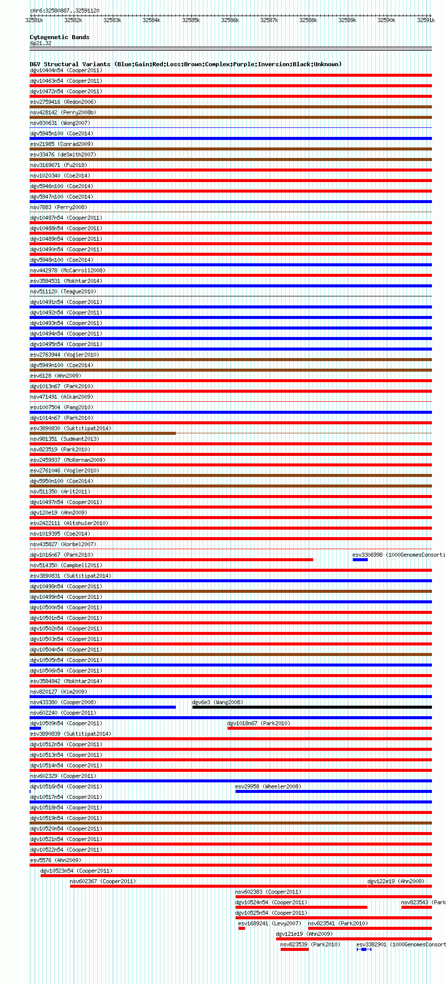 Variant DetailsVariant: nsv602355| Internal ID | 16389764 | | Landmark | | | Location Information | | | Cytoband | 6p21.32 | | Allele length | | Assembly | Allele length | | hg38 | 10234 | | hg19 | 10234 | | hg18 | 10234 |