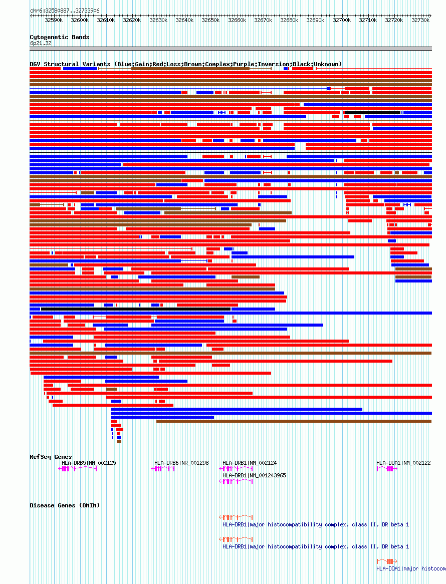 Variant DetailsVariant: nsv602356| Internal ID | 16389765 | | Landmark | | | Location Information | | | Cytoband | 6p21.32 | | Allele length | | Assembly | Allele length | | hg38 | 153020 | | hg19 | 153020 | | hg18 | 153020 |