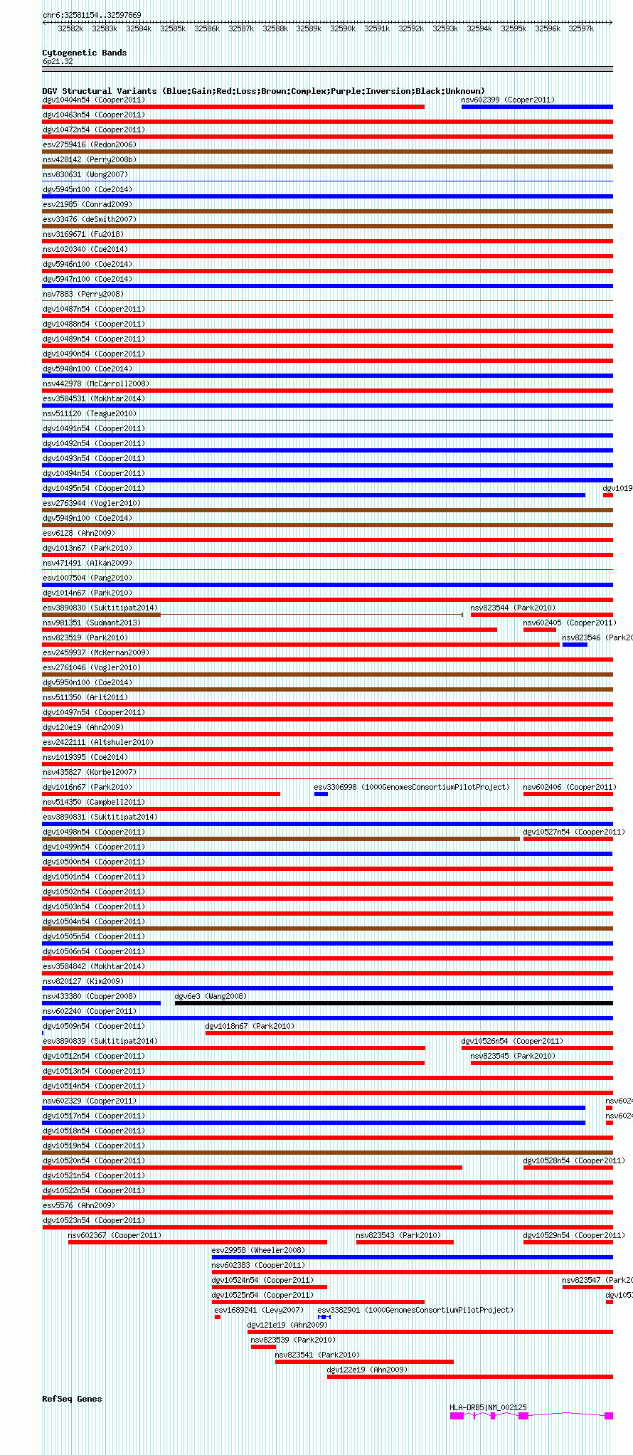 Variant DetailsVariant: nsv602360| Internal ID | 16389769 | | Landmark | | | Location Information | | | Cytoband | 6p21.32 | | Allele length | | Assembly | Allele length | | hg38 | 16716 | | hg19 | 16716 | | hg18 | 16716 |