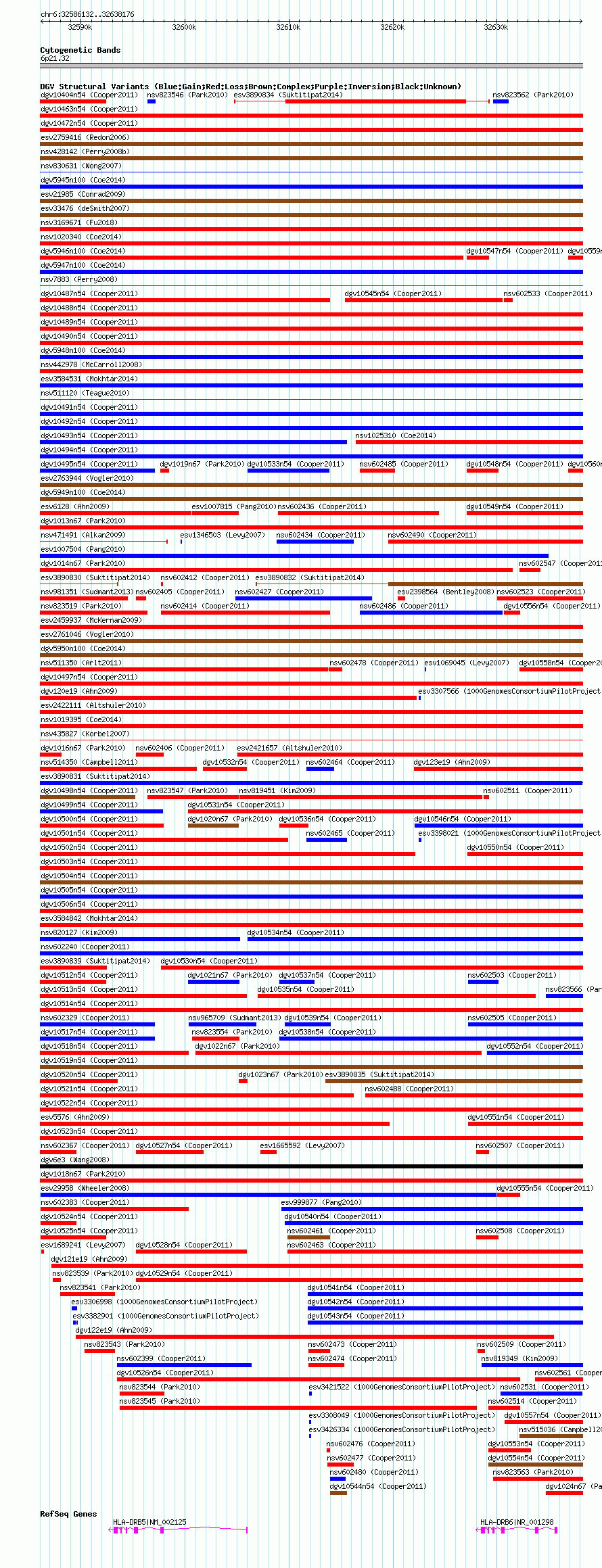 Variant DetailsVariant: nsv602387| Internal ID | 16389796 | | Landmark | | | Location Information | | | Cytoband | 6p21.32 | | Allele length | | Assembly | Allele length | | hg38 | 52045 | | hg19 | 52045 | | hg18 | 52045 |