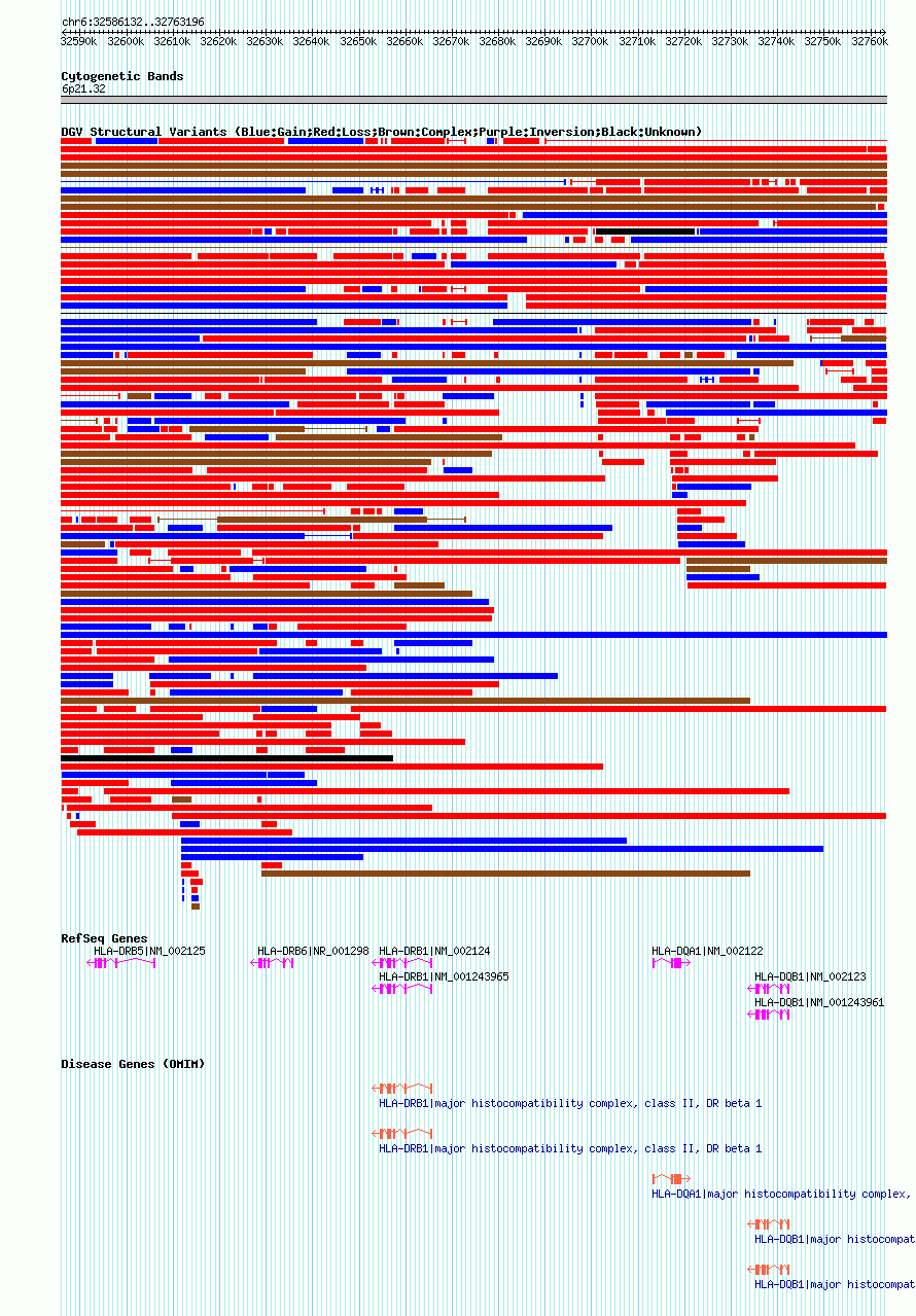 Variant DetailsVariant: nsv602395| Internal ID | 16389804 | | Landmark | | | Location Information | | | Cytoband | 6p21.32 | | Allele length | | Assembly | Allele length | | hg38 | 177065 | | hg19 | 177065 | | hg18 | 177065 |