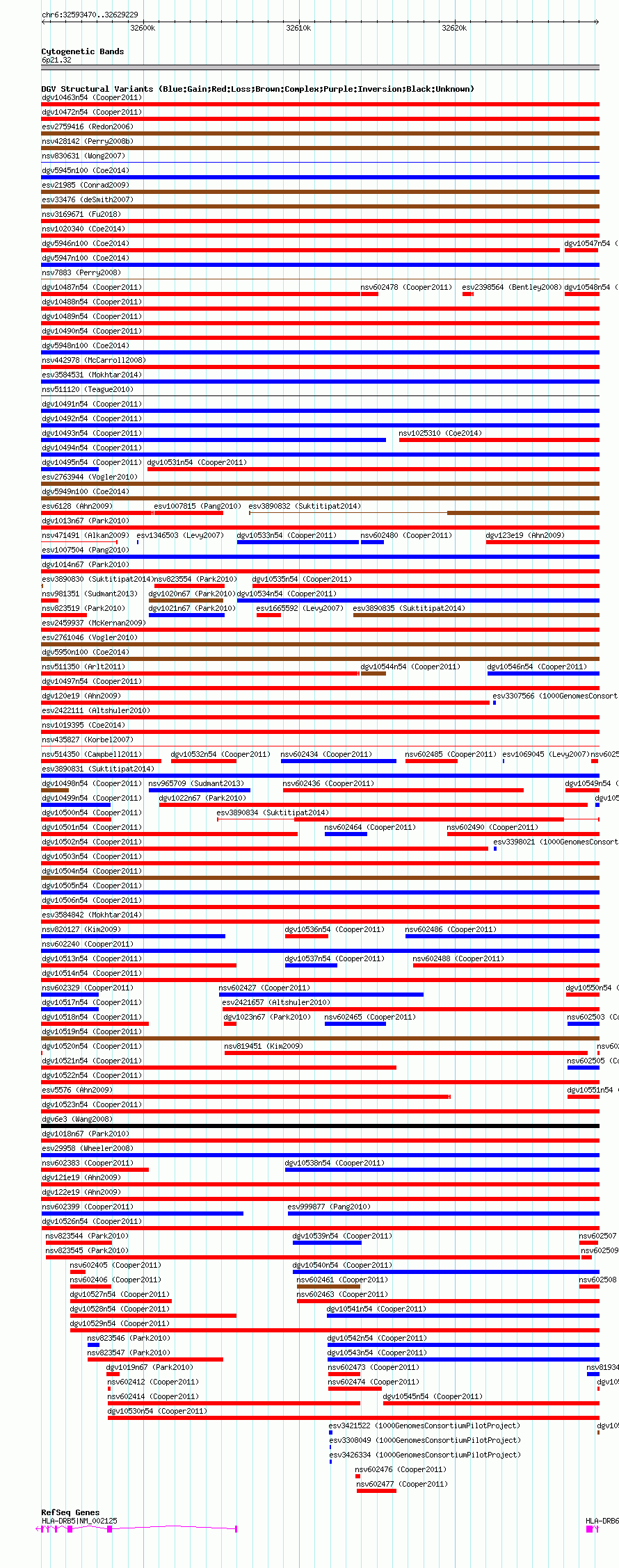 Variant DetailsVariant: nsv602401| Internal ID | 16389810 | | Landmark | | | Location Information | | | Cytoband | 6p21.32 | | Allele length | | Assembly | Allele length | | hg38 | 35760 | | hg19 | 35760 | | hg18 | 35760 |