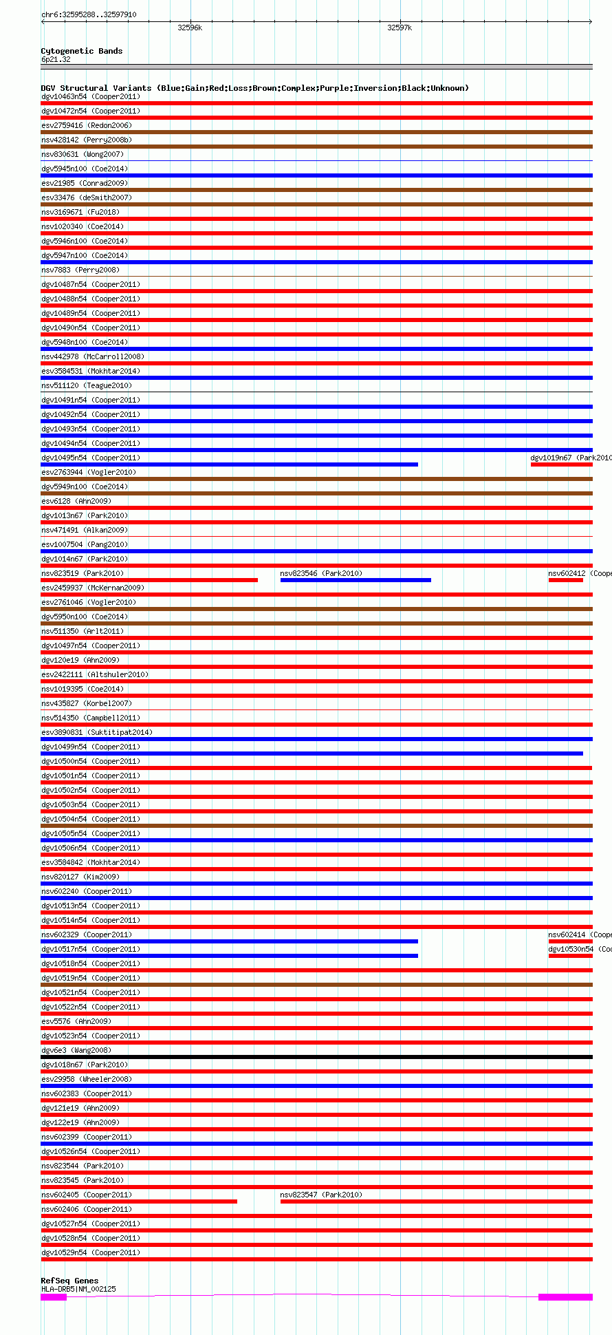 Variant DetailsVariant: nsv602406| Internal ID | 16389815 | | Landmark | | | Location Information | | | Cytoband | 6p21.32 | | Allele length | | Assembly | Allele length | | hg38 | 2623 | | hg19 | 2623 | | hg18 | 2623 |