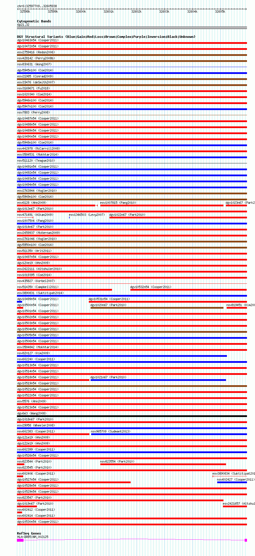Variant DetailsVariant: nsv602413| Internal ID | 16389822 | | Landmark | | | Location Information | | | Cytoband | 6p21.32 | | Allele length | | Assembly | Allele length | | hg38 | 8230 | | hg19 | 8230 | | hg18 | 8230 |
