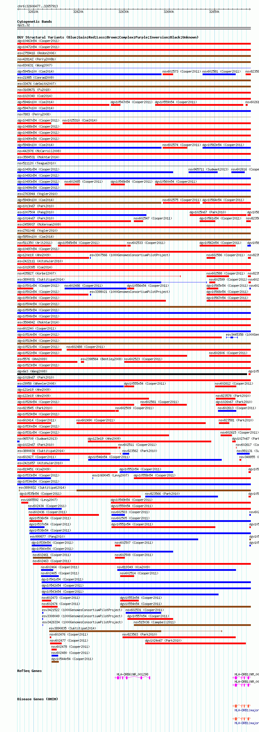 Variant DetailsVariant: nsv602432| Internal ID | 16389841 | | Landmark | | | Location Information | | | Cytoband | 6p21.32 | | Allele length | | Assembly | Allele length | | hg38 | 51437 | | hg19 | 51437 | | hg18 | 51437 |